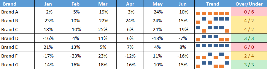 Bias is measured over time. A single data point on its own cannot reveal bias. In the example below, Brand A and E both have serious bias issues. Brand D and G are in good shape.